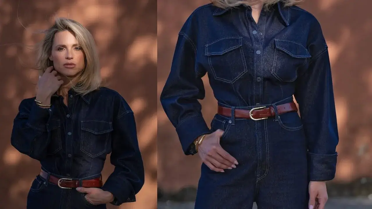 La combinaison en jean structurée, parfaitement cintrée à la taille par une ceinture en cuir camel à boucle dorée, souligne sa silhouette avec raffinement. Avec ses coutures contrastées et ses poches à rabats sur la poitrine, cette pièce emprunte à l’esthétique du workwear classique, qu’elle dépoussière avec une touche de modernité audacieuse. Ce look incarne à merveille l’équilibre entre force et féminité.